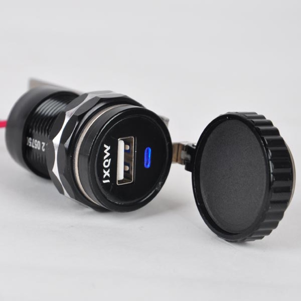 Ένας φορτιστής μοτοσικλέτας USB με προστατευτικό κάλυμμα για την βροχή.